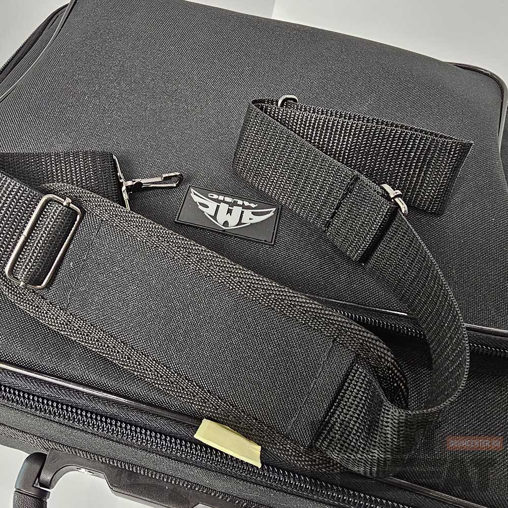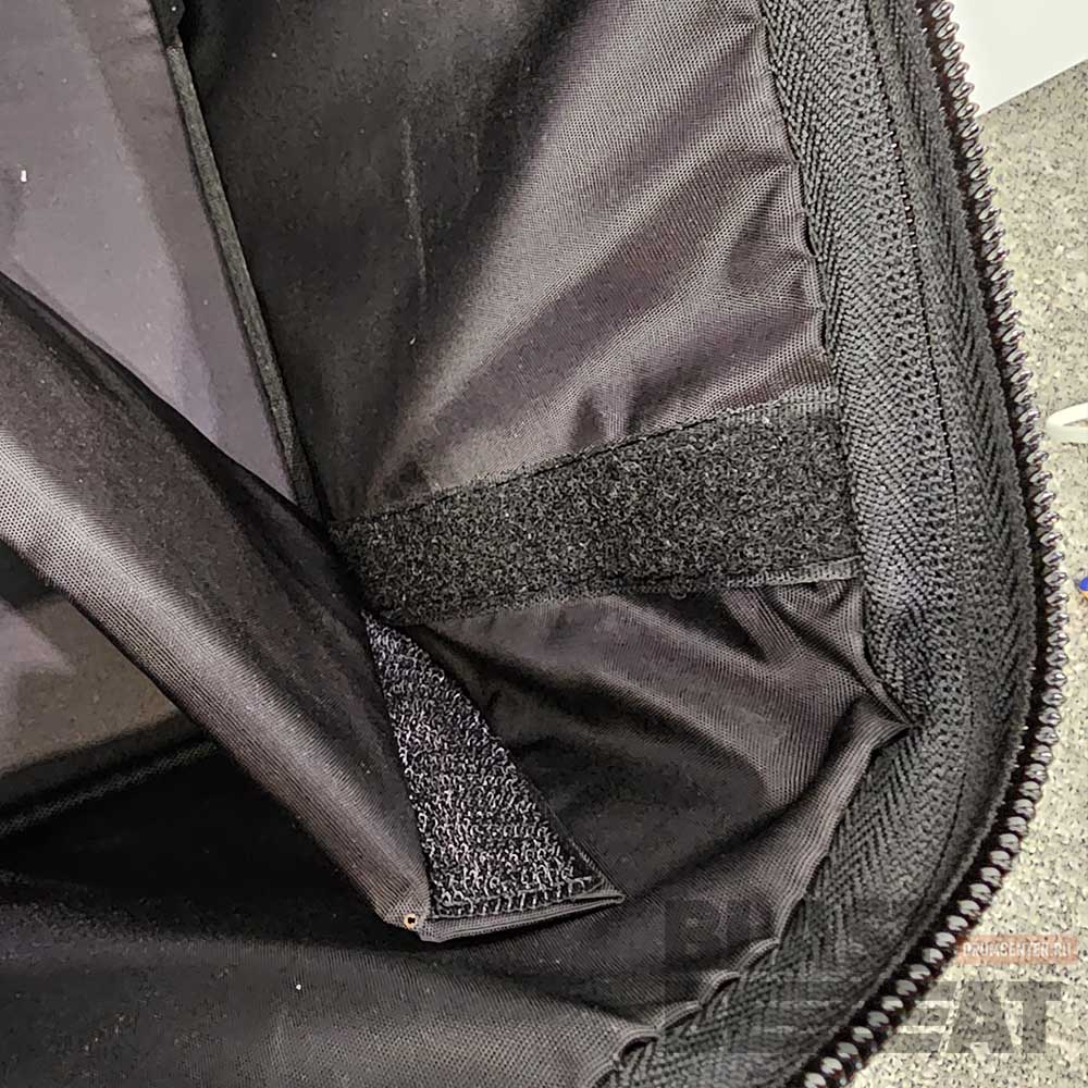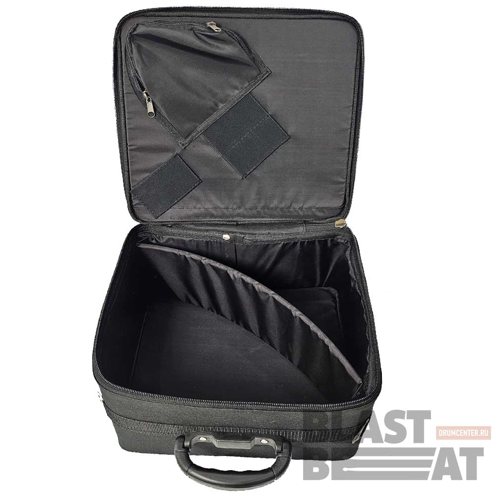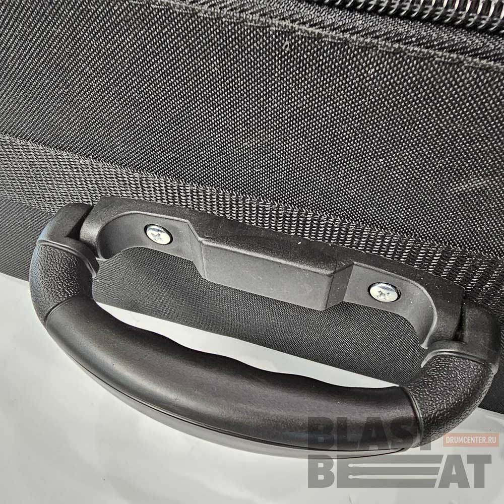 - Жёсткая пластиковая основа, внутри разделитель педалей на липучках, отделение для карданного вала, внешний карман для барабанных мелочей