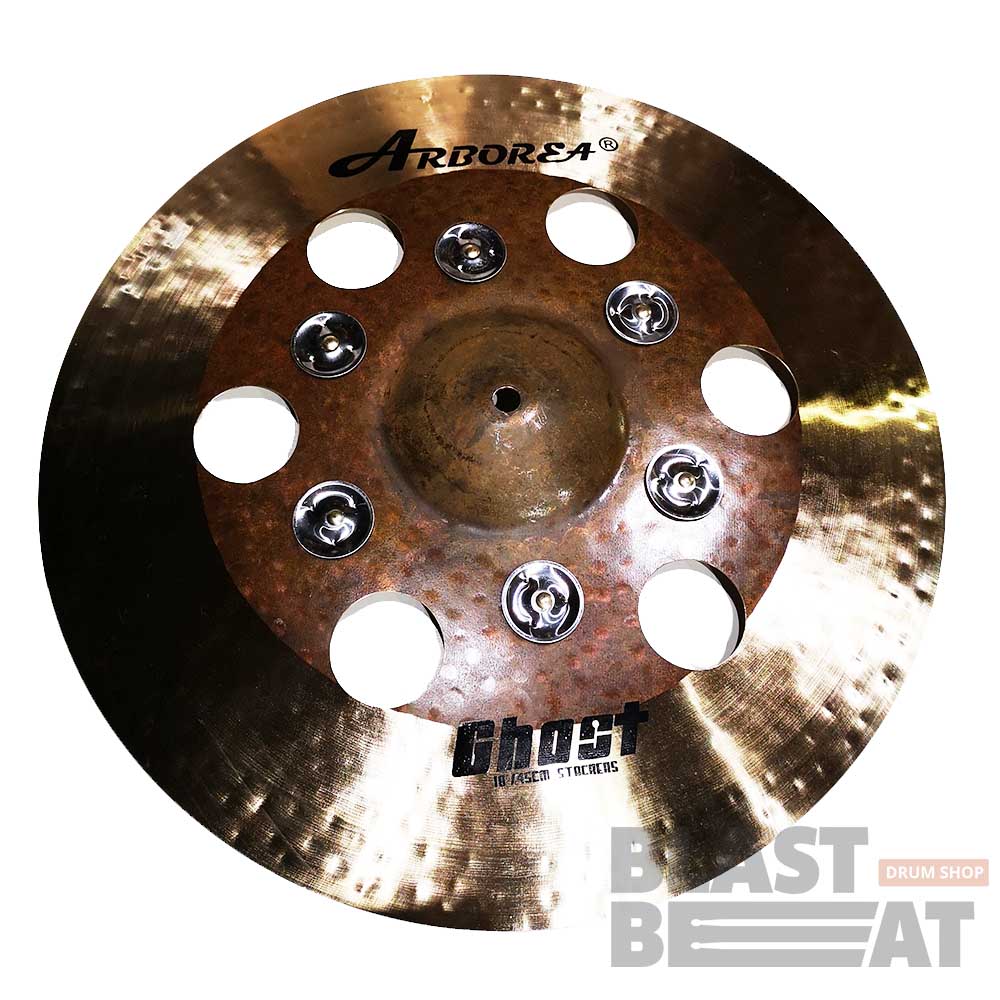 16-дюймовая бронзовая эффектовая тарелка O-Zone Ghost Series Tamborine Crash с отверстиями и джинглами из линейки Arborea Ghost Series GH14AO. Сплав бронзы: 78% меди и 22% олова.
