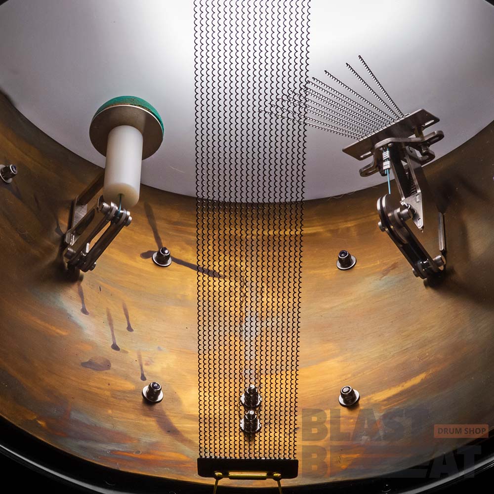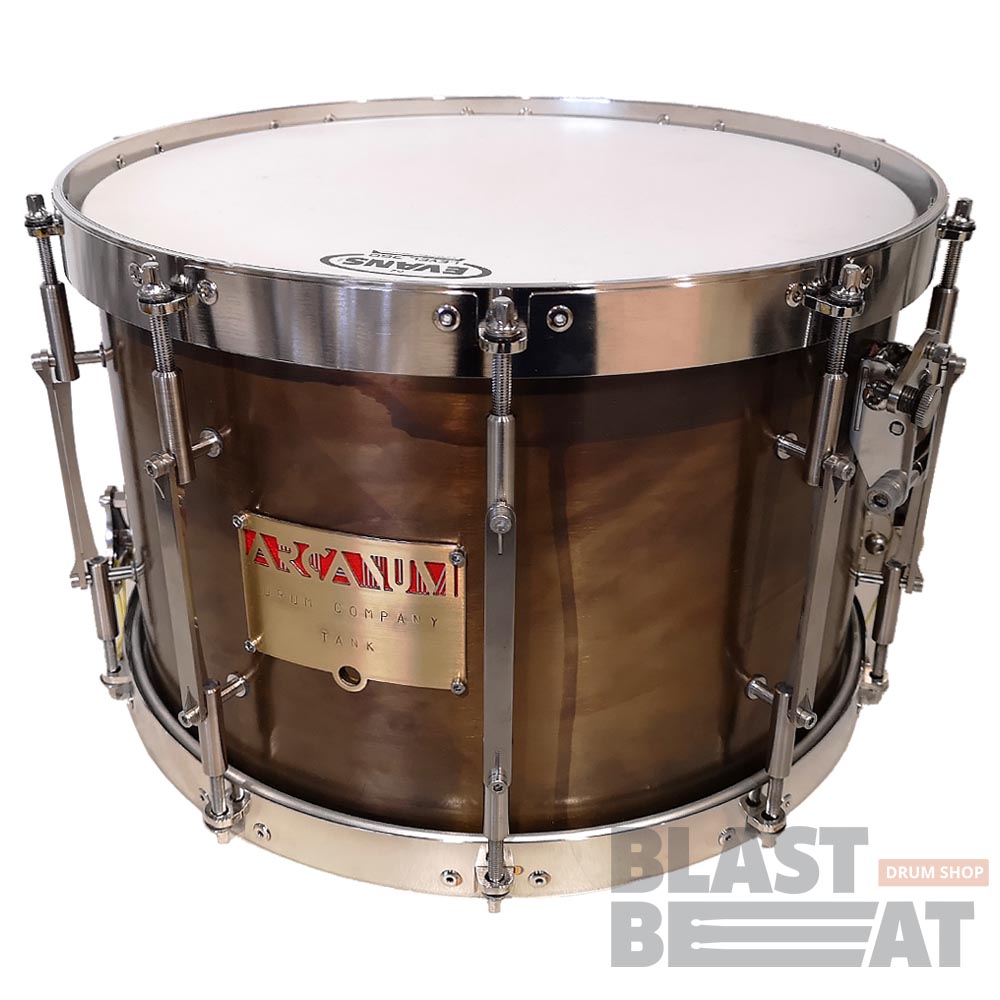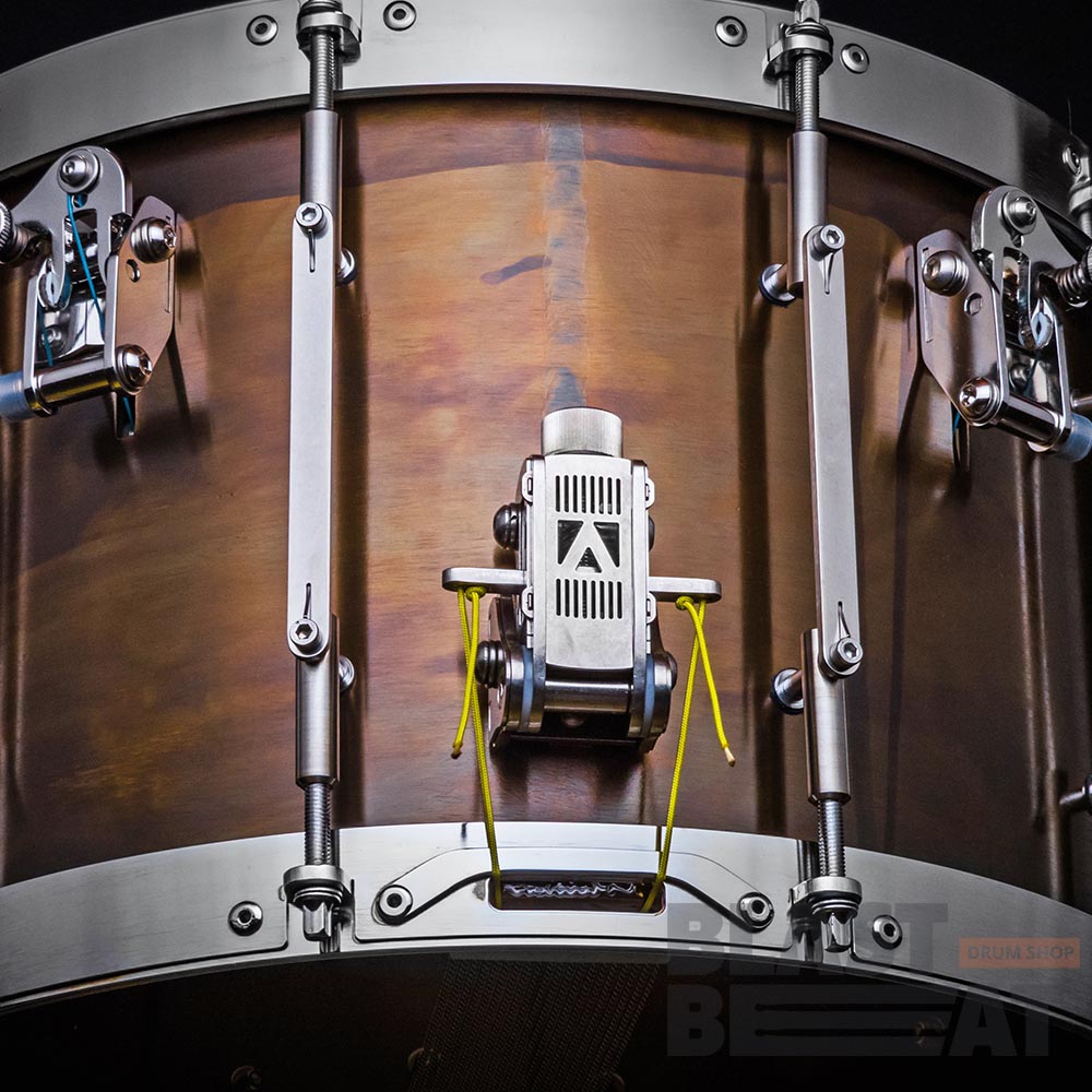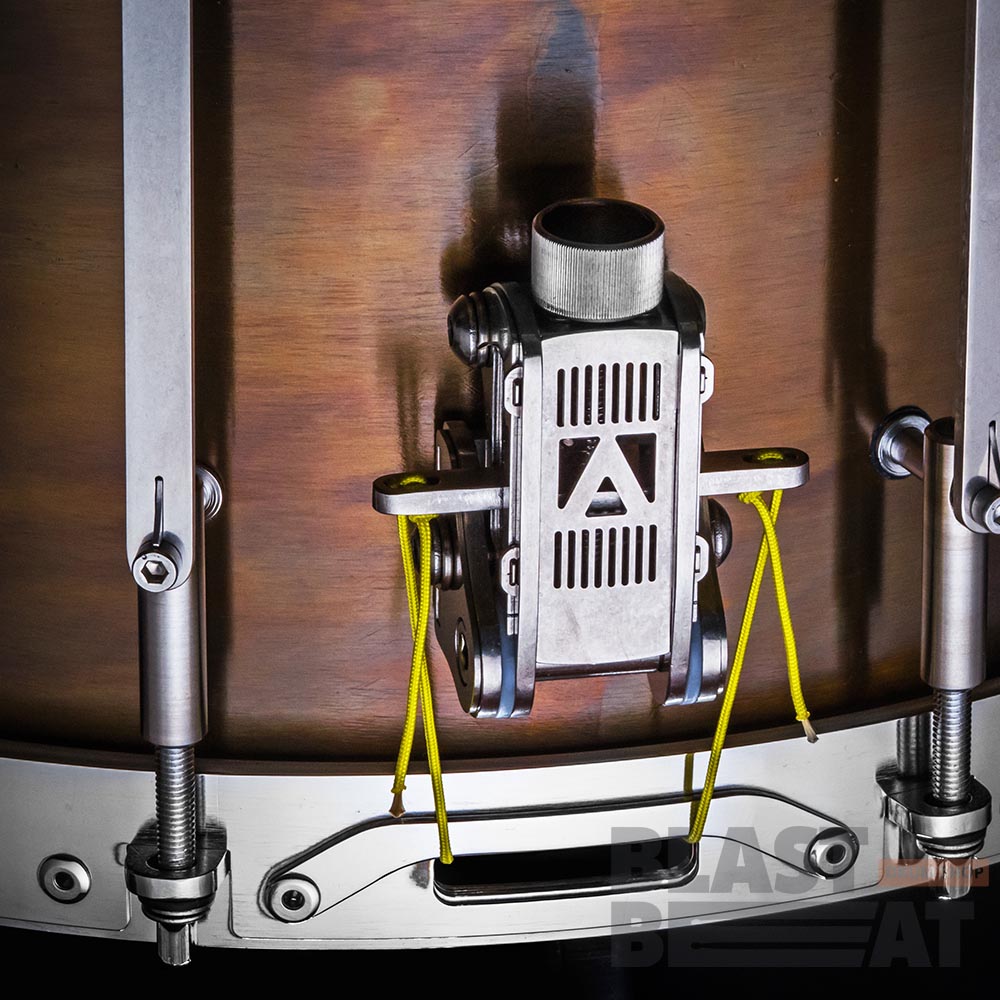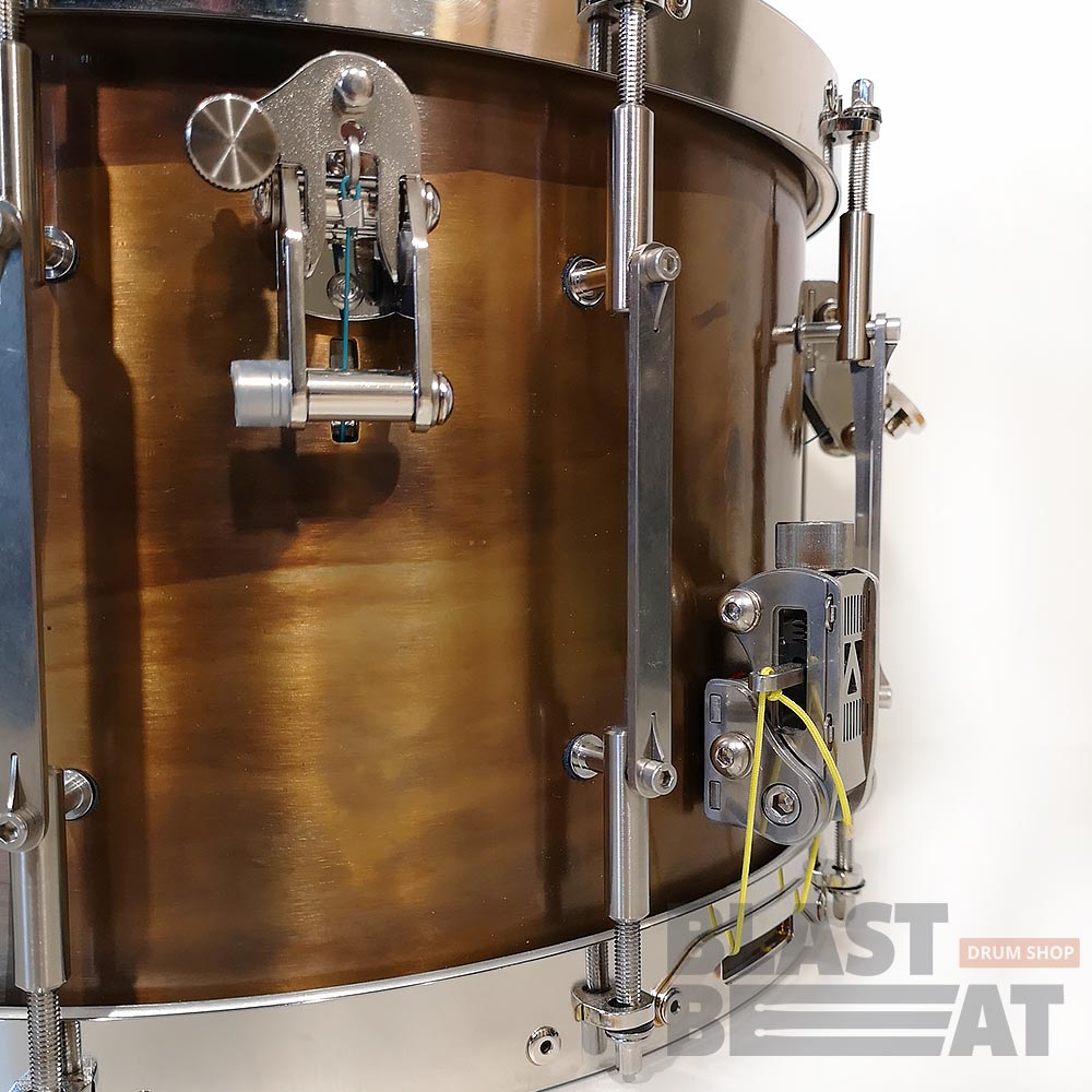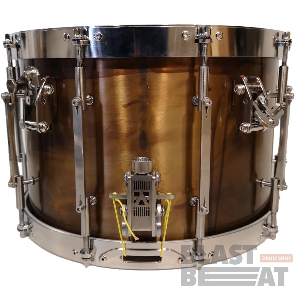 Глубокий латунный малый барабан 14 на 9 дюймов с внутренним откидным демпфером и подструнником из серии TANK от компании Arcanum Drum Company.