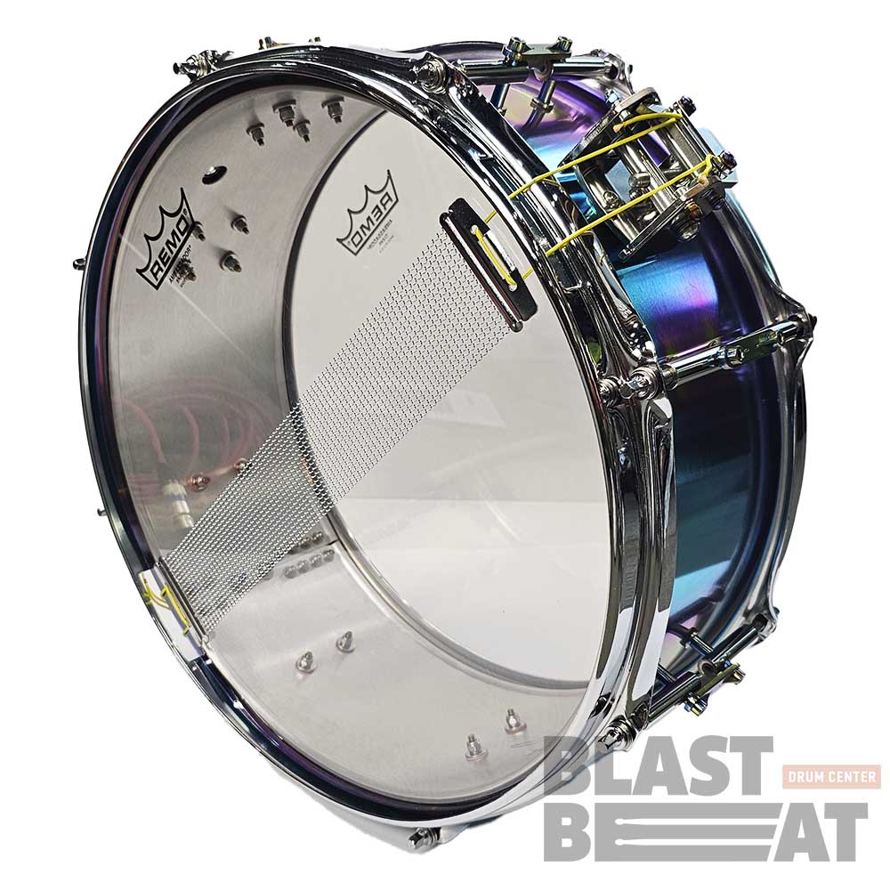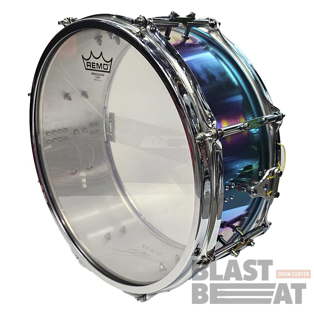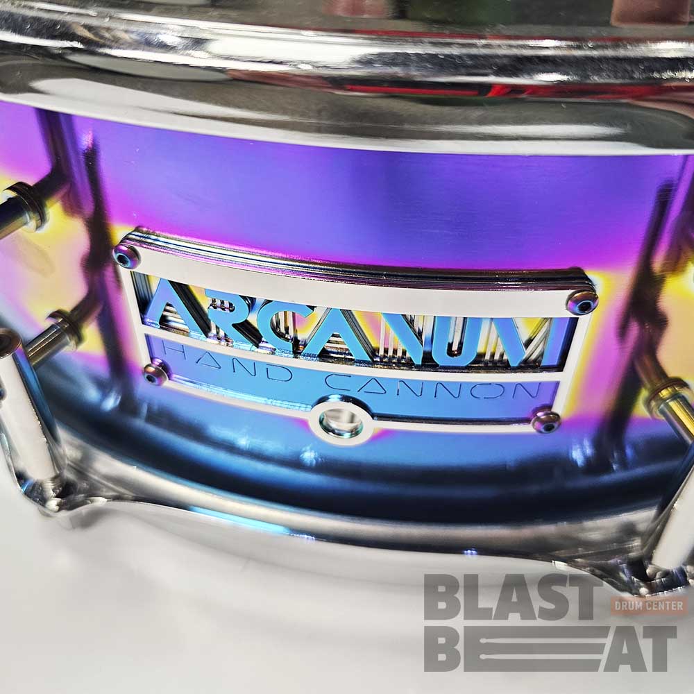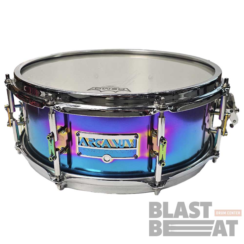 Великолепный малый барабан 14 на 5 дюймов из нержавеющей стали в расцветке "Хамелеон", из серии Hand Cannon Air от компании Arcanum Drum Company.