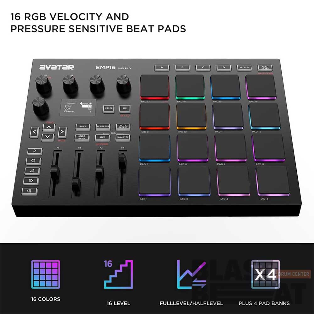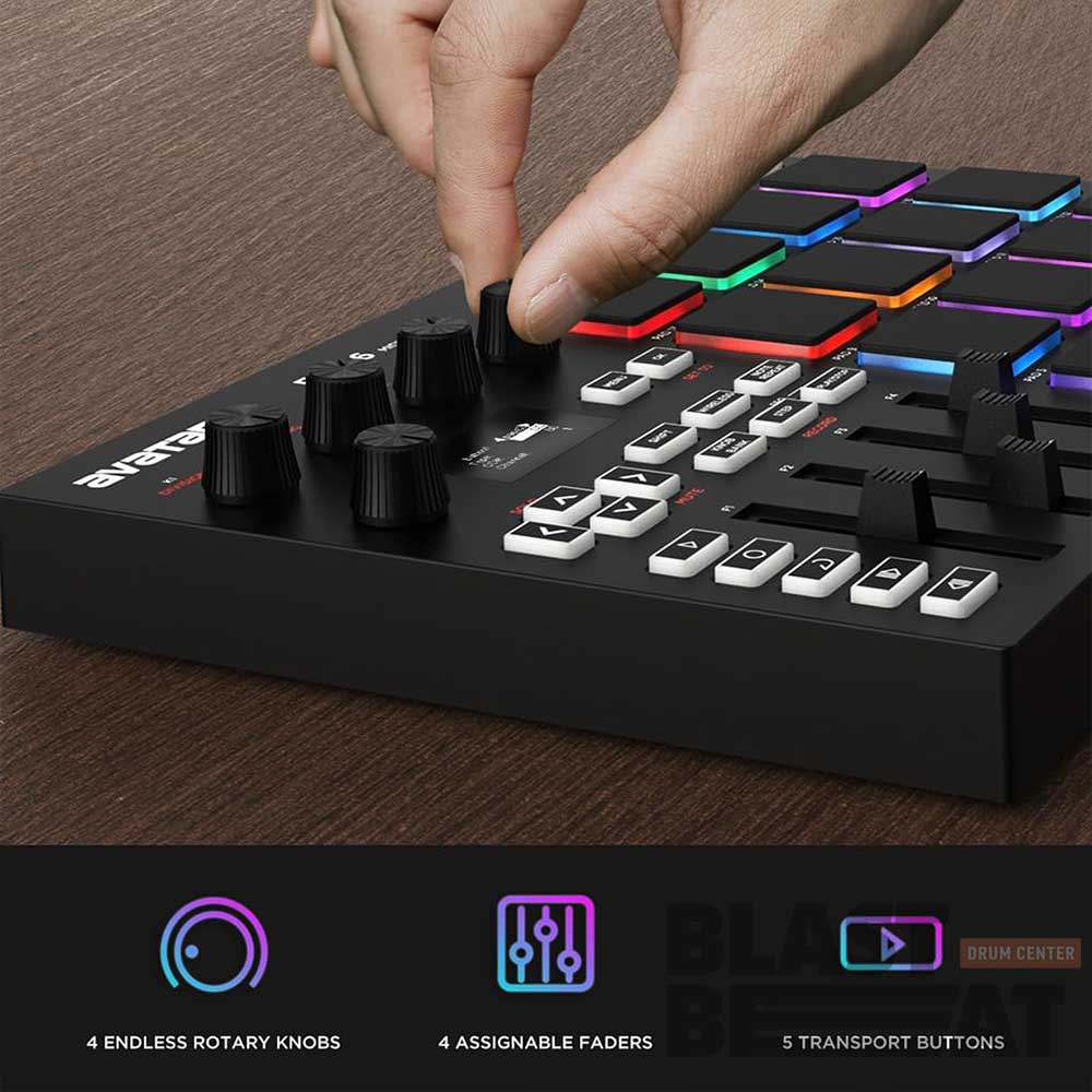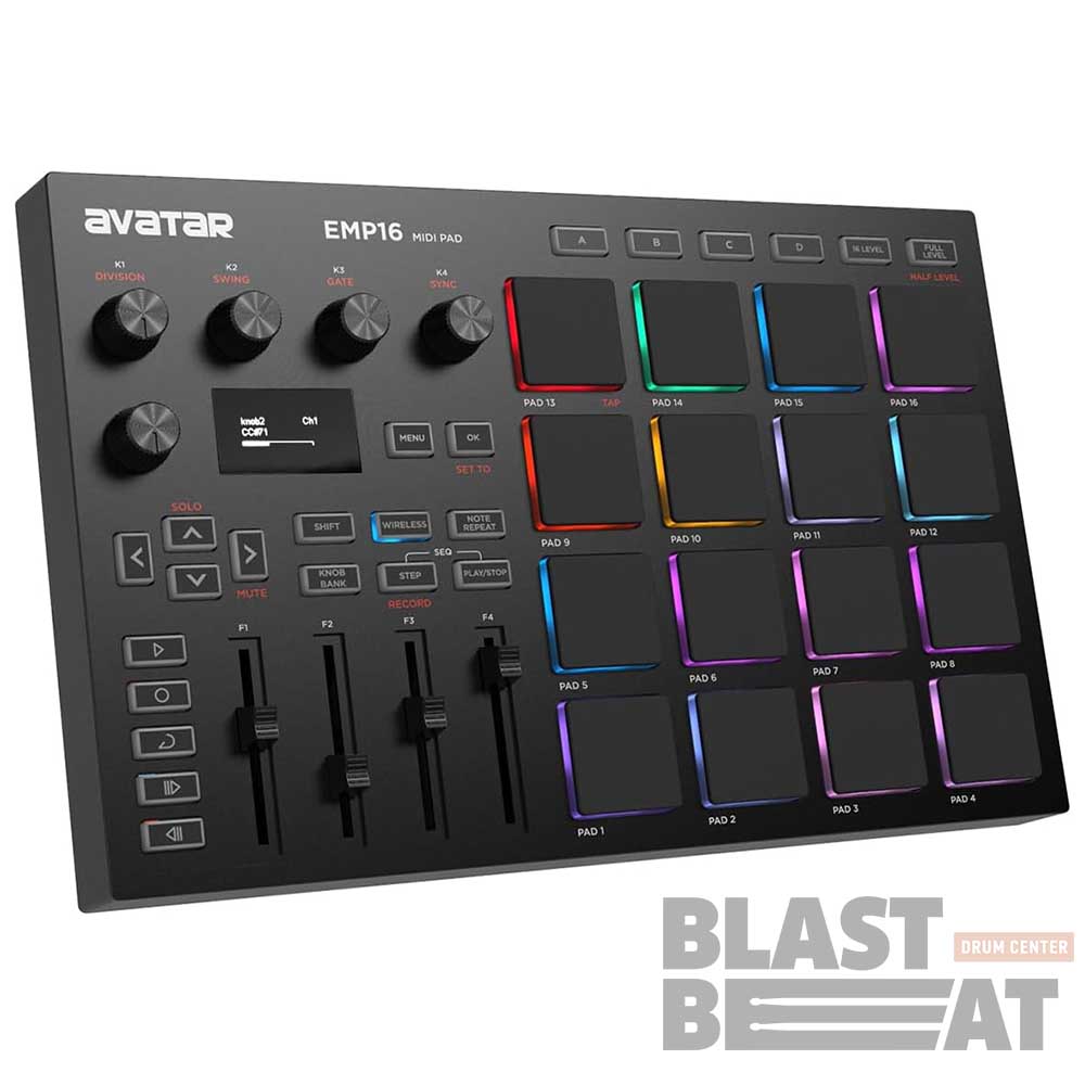 Выразительное воспроизведение - midi-пэд-контроллер EMP16 от Avatar - это идеальный аккомпанемент для любого создателя музыки, запускающего барабаны, студийную запись и перформанс. 16 пэдов с подсветкой RGB, а также с 4 блоками расширяемых элементов управления, что в общей сложности дает 64 назначаемых пэда.