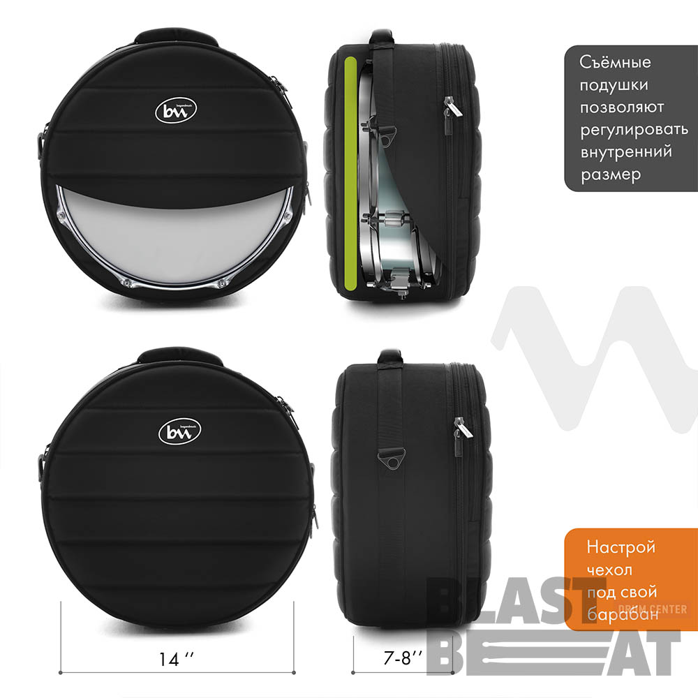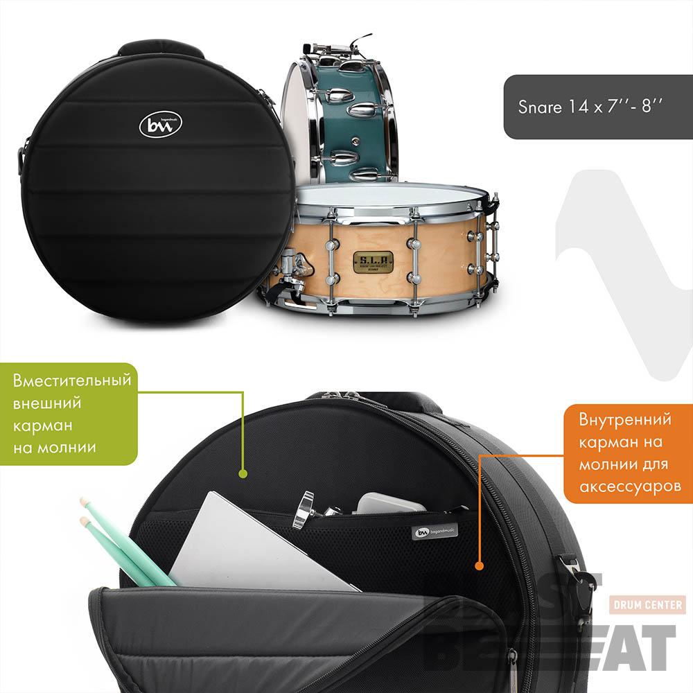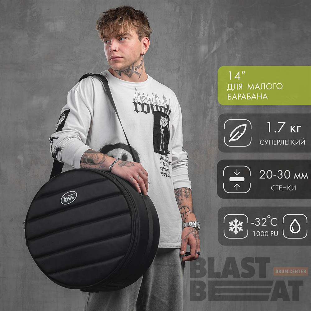 Надежный и эргономичный чехол для глубокого малого барабана диаметром 14 дюймов и глубиной от 7 до 8 дюймов, разработанный совместно с Российским Барабанным Центром компанией bagandmusic (bm).