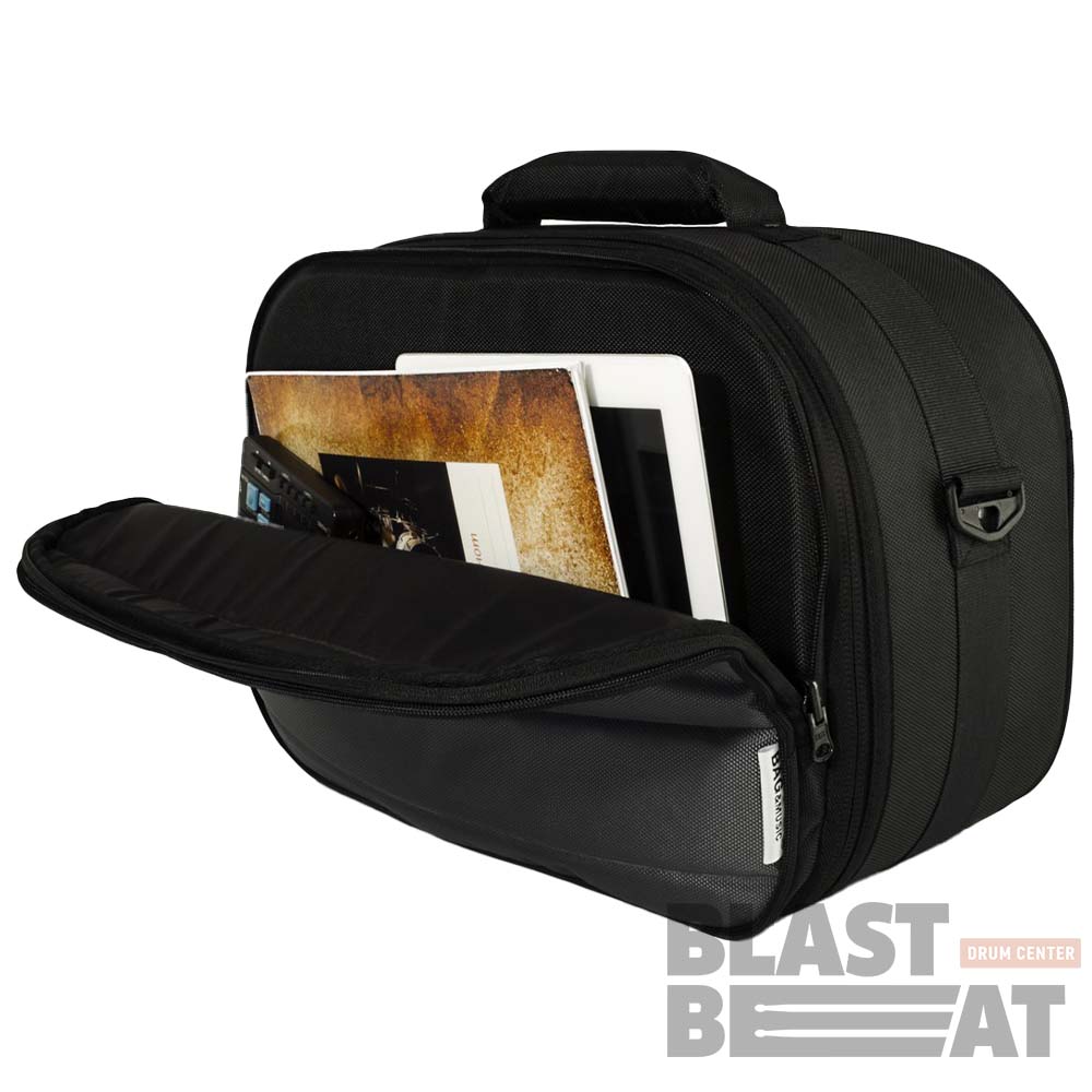 - Оснащён передним достаточно вместительным карманом на молнии. В нем можно хранить ноты, ключ, метроном, палочки, пэд