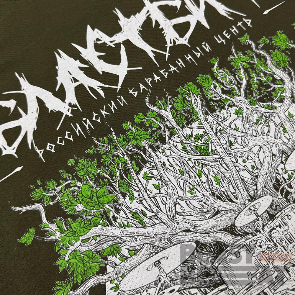 Уникальный арт, созданный талантливым художником и барабанщиком Тимуром Хабировым специально для Драмцентра. Спереди на груди маленький логотип Blastbeat Drum Center.