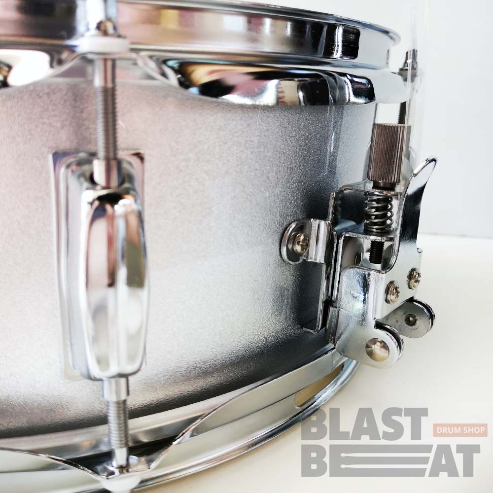 Комплект маршевого малого барабана 14 на 5 дюймов Brahner в серебристом (сером) цвете с барабанными палочками и ремнём.