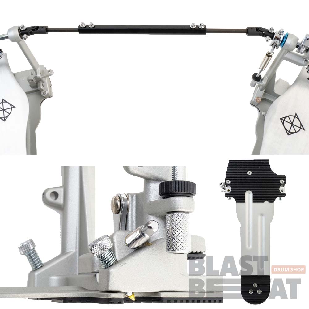 Основание двух педалей имеет достаточно большую площадь опоры с резиновым покрытием, что гарантирует отличную устойчивость и предотвратит скольжения. Также для более надежного позиционирования в педали предусмотрено крепление к ободу большого барабана, которое фиксируется при помощи стандартного барабанного ключа, и выдвижные шипы, которые помогут надежно зафиксировать педаль на ковре.