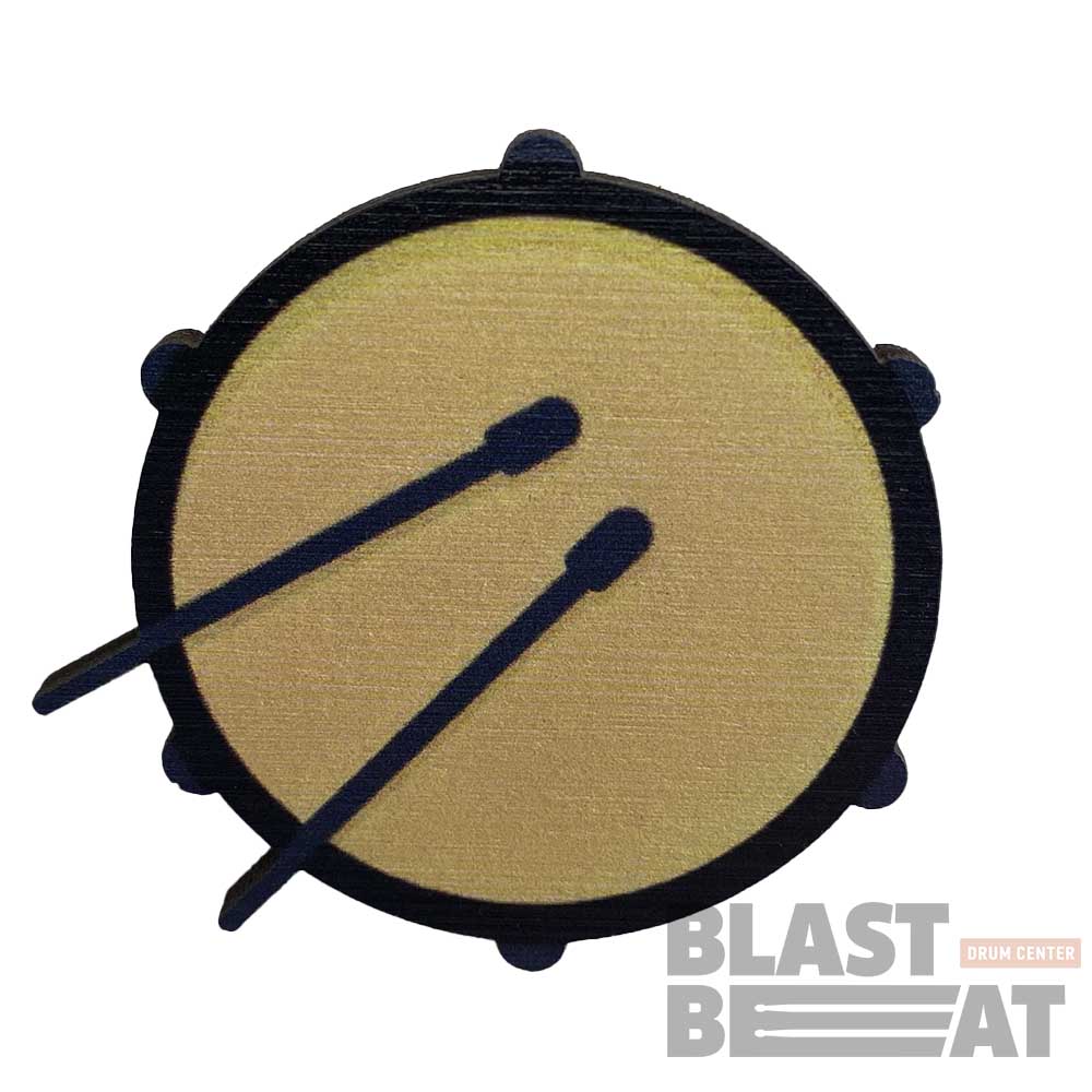 Деревянный значок с рисунком малого барабана с палочками, на стальной булавке