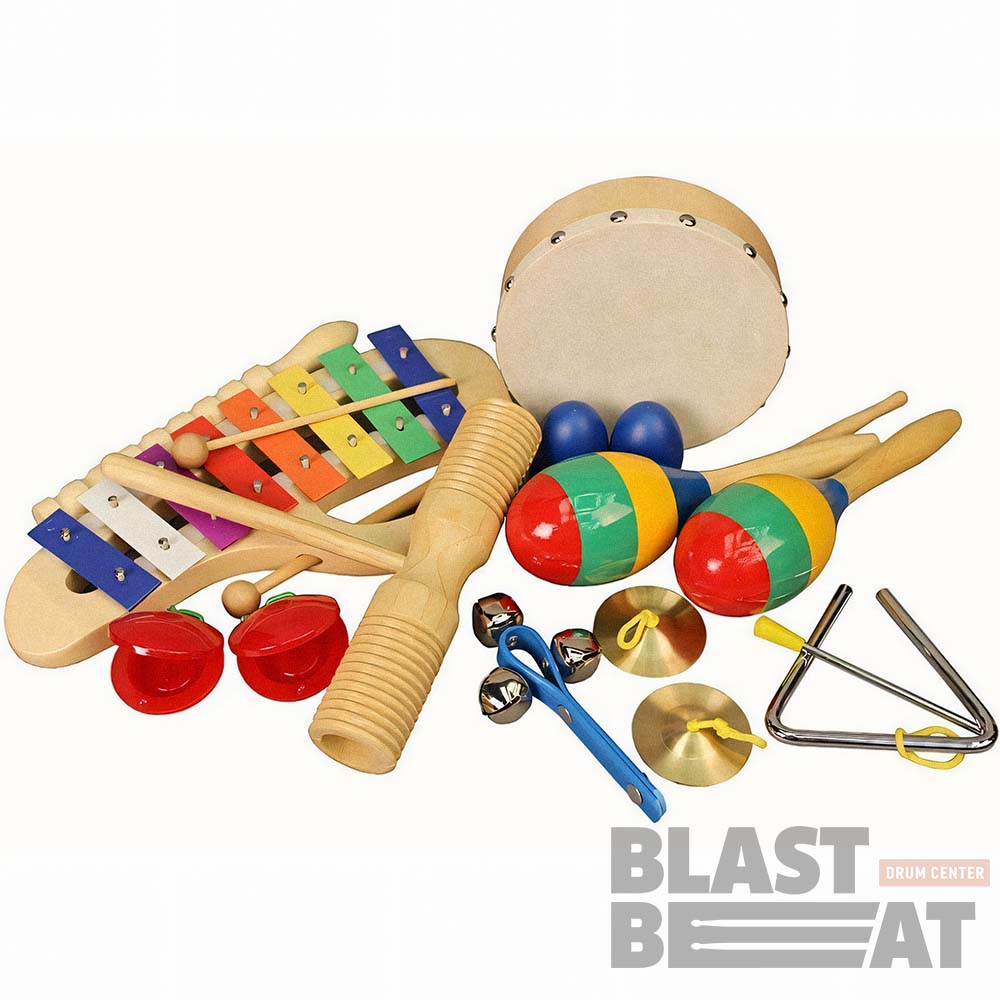 В набор входят разноцветный металлофон с палочкой, круглый тамбурин с натуральной мембраной, пара разноцветных маракас, пара пластиковых кастаньет, пара шейкеров в форме "яиц", цимбал, гуиро, тон-блок, металлический треугольник с палочкой и джингл-стик.