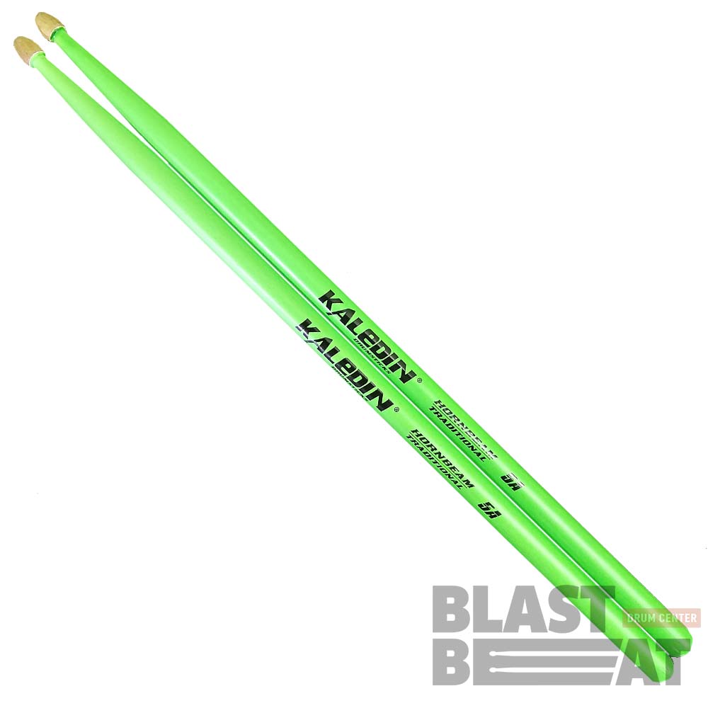 Светящиеся в ультрафиолете зеленые барабанные палочки из граба размера 5A, сделанные в России компанией Kaledin Drumsticks (Краснодар).