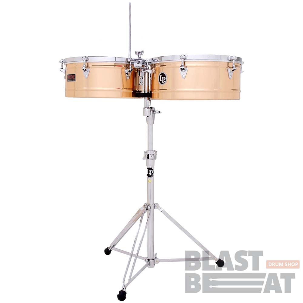 Бронзовые тимбалес 14" и 15" на стойке с держателем для ковбелла Latin Percussion LP1415-BZ Timbales Prestige Bronze.