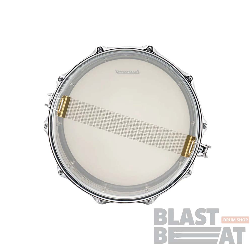 Барабан оснащен хромированными латунными трубчатыми лагами, ободами с тройным фланцем и латунным подструнником.