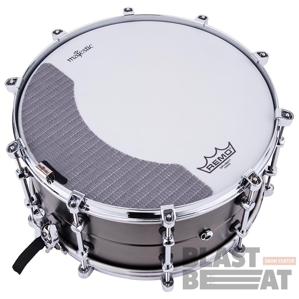 - Накладной зажим для легкого и надежного крепления демпефрной накладки к ободу барабана. С выгравированным лазером логотипом Majestic и указанием модели.