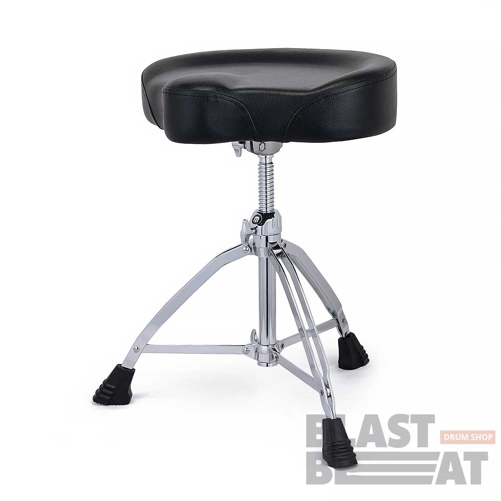 Винтовой стул с мото-седлом. Благодаря виниловому верху седловидной формы размером 17 x 4 дюйма Mapex T855 создан для максимального комфорта барабанщика.