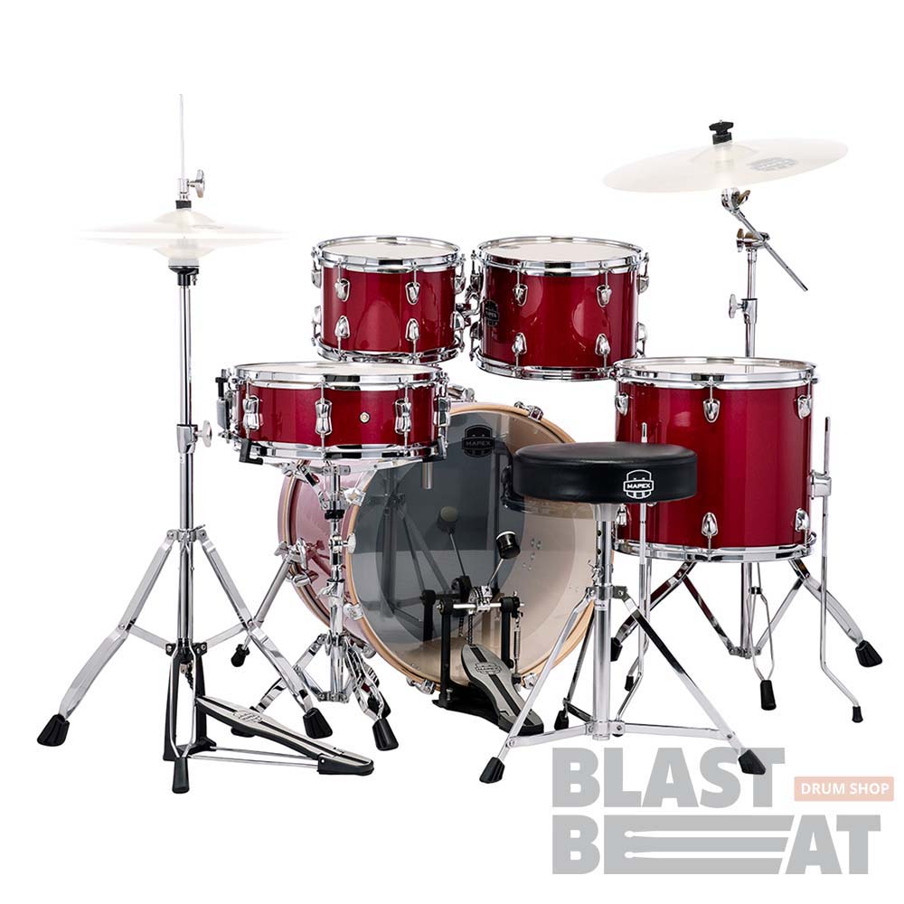 Комплект барабанов со стойками, стулом и педалью ударной установки серии Venus от компании Mapex Drums, выполненную в потрясающем дизайне Crimson Red Sparkle.
