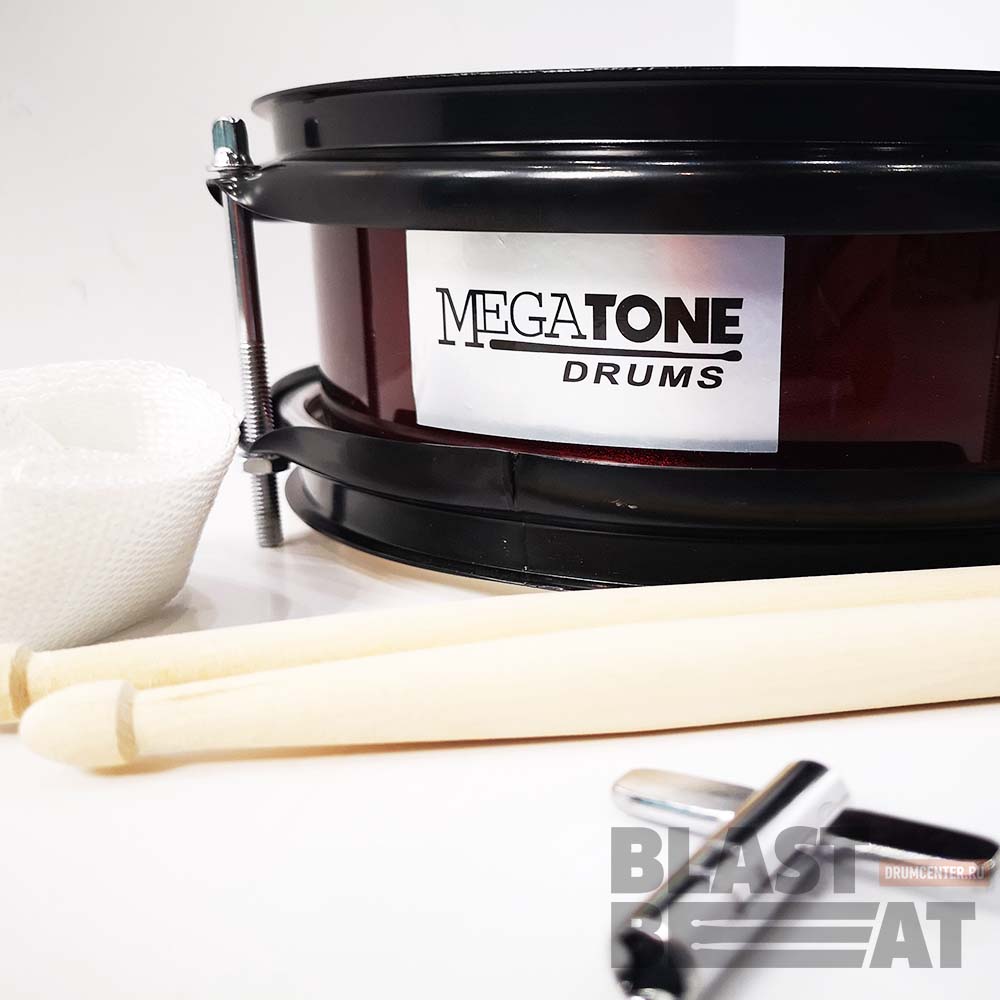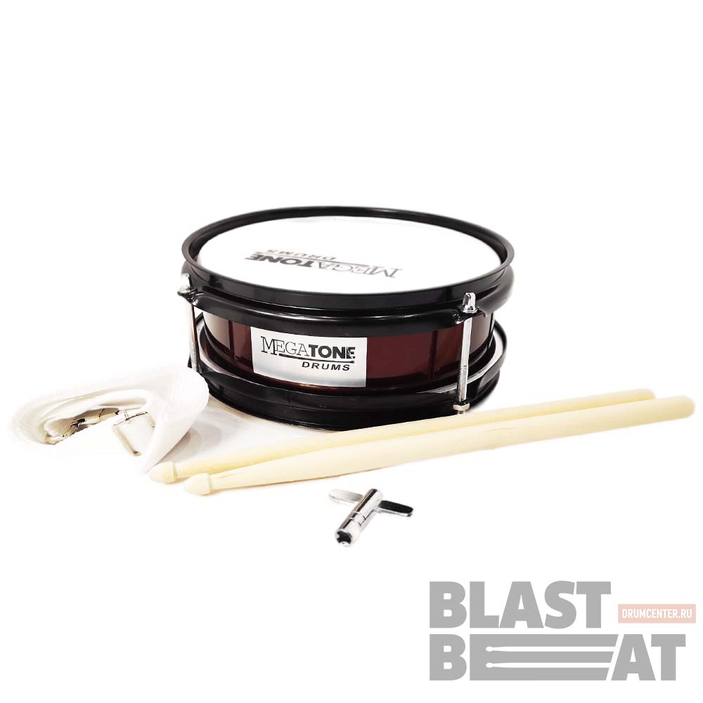 Маленький неглубокий детский маршевый барабан Megatone KSD-83/MRD в комплекте с нейлоновым наплечным ремнем и палочками.