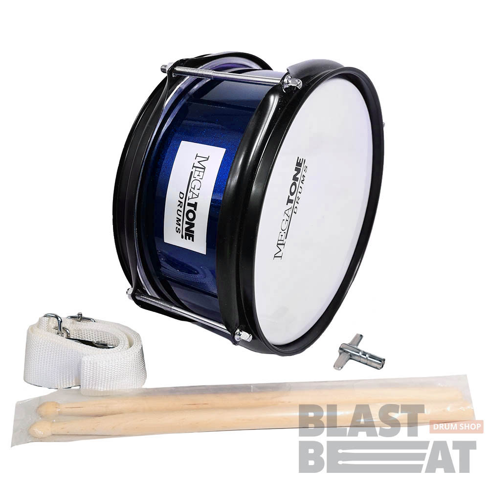 Маленький неглубокий детский маршевый барабан Megatone KSD-84/MSV в комплекте с нейлоновым наплечным ремнем и палочками.