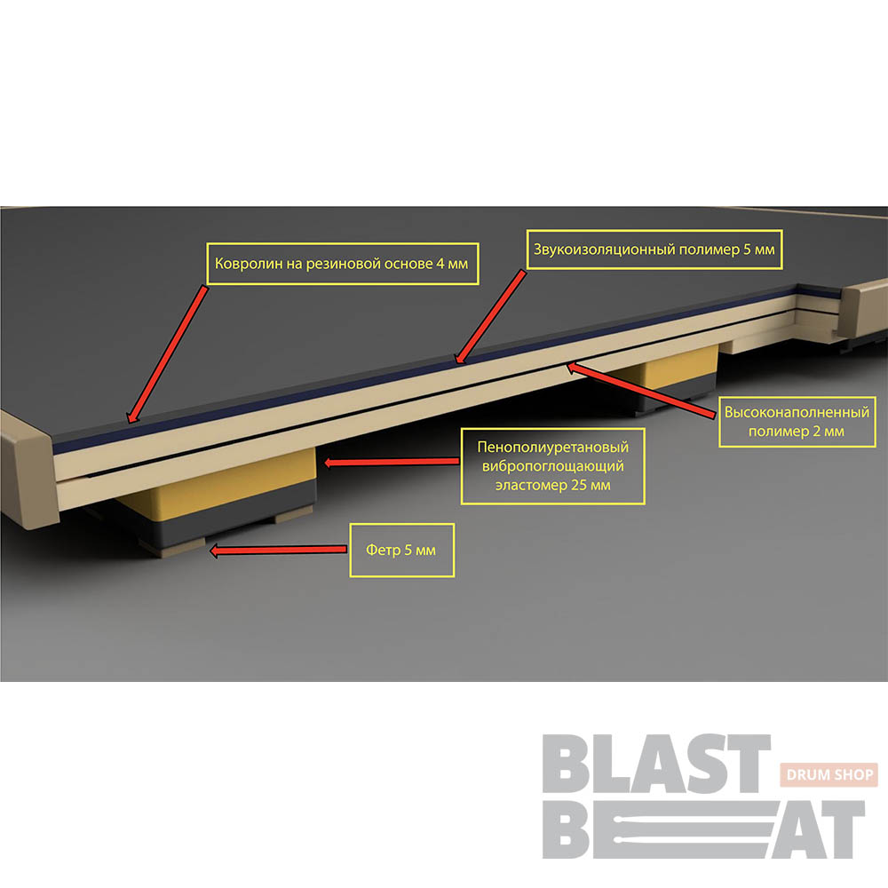 Основа платформы устанавливается на опоры из полиуретанового эластомера от австрийского производителя, который специализируется на разработке материалов для виброизоляции многотонных промышленных станков, жд путей, фундаментов зданий, боулинг клубов и фитнес-центров.