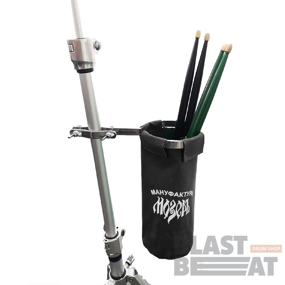 Мягкий универсальный тканевый стакан "колчан" для барабанных палочек, маллет, рутов или щеток с клэмпом-креплением за стойку.