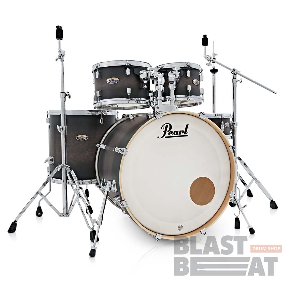Полный комплект акустической ударной установки серии Decade Maple от Pearl Drums, в который входят 5 барабанов и набор стоек с педалью.