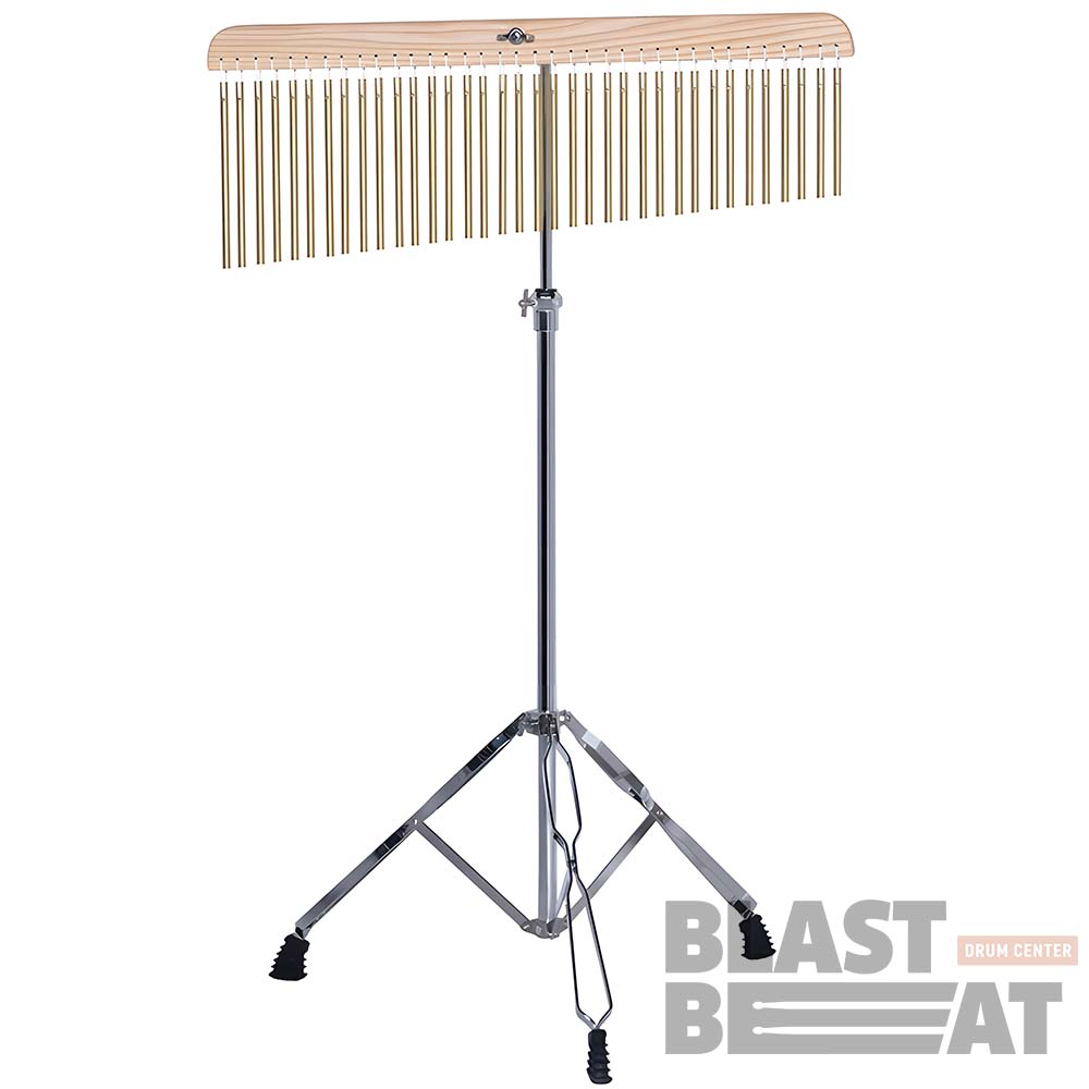 Изящный перкуссионный инструмент, состоящий из 36 подвешенных металлических трубок золотистого цвета разной длины, установленных на прочной стойке. Звук инструмента возникает, когда трубки мягко сталкиваются друг с другом, создавая тонкие, мелодичные перезвоны, наполненные воздушностью и гармонией. Игра осуществляется путём аккуратного движения руки или лёгкого прикосновения металлической палочкой, приводящей трубки в колебание. В зависимости от направления движения — слева направо или справа налево — можно добиться как нисходящего, так и восходящего звукового эффекта, добавляя выразительности исполнению.