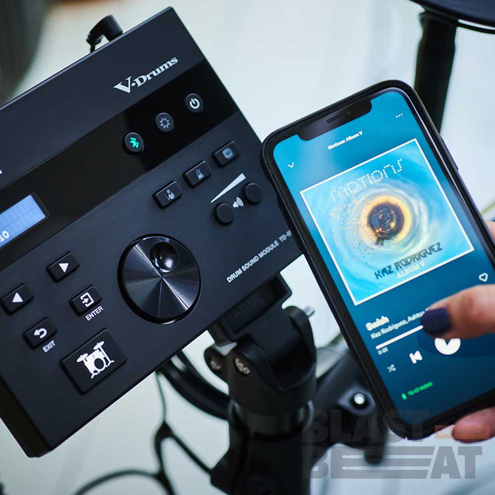 TD-07DMK предусматривает возможность игры под аккомпанемент любимых команд. Достаточно просто подобрать соответствующий материал на смартфоне, в планшете или компьютере, а затем передать потоковый аудиосигнал в звуковой модуль TD-07. Передается не только звук, но и видео, так что можно воспроизводить видеоклипы и видеоуроки. Кроме того, поддерживается передача MIDI-информации по Bluetooth для беспроводной записи MIDI-данных в музыкальные программные приложения. Если же подходящего устройства Bluetooth под рукой не оказалось, можно завести стереозвук и по кабелю.