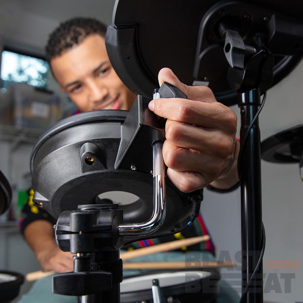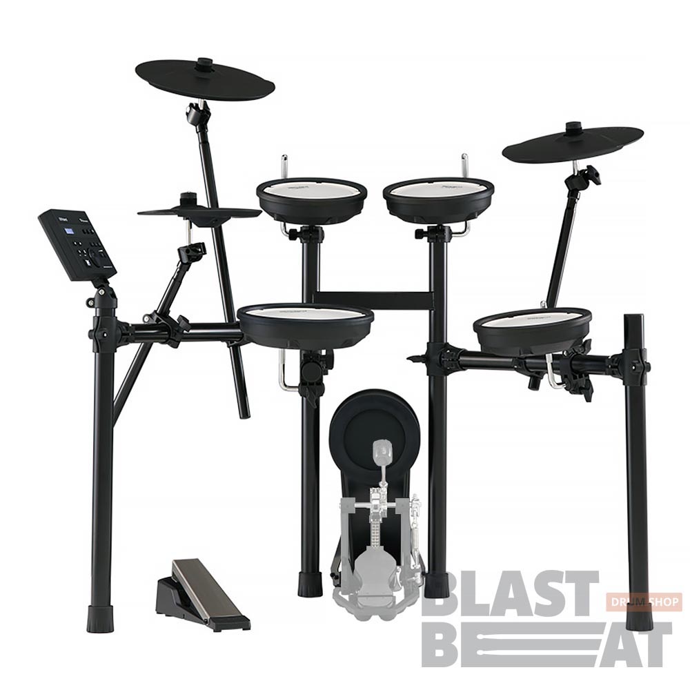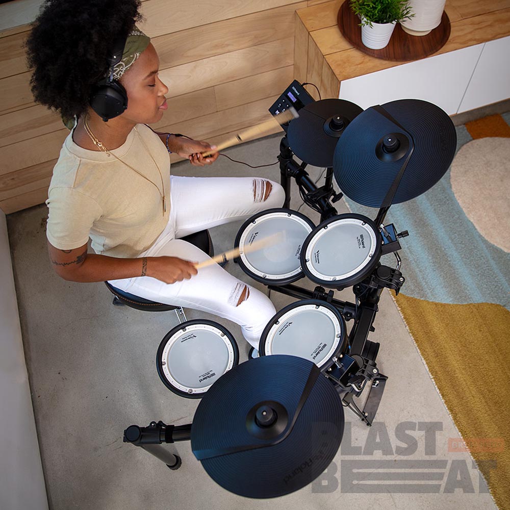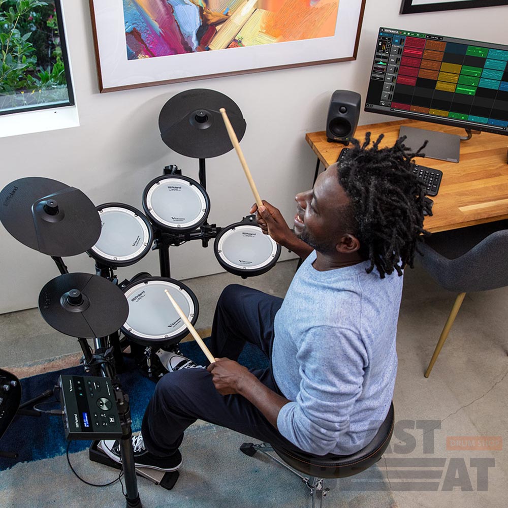 Пэды малого барабана и томов оборудованы производящими мало шума при игре двухслойными сетчатыми мембранами Mesh Head компании Roland, а для получения полного представления о преимуществах данной установки добавьте сюда еще большие пэды тарелок крэш и райд и специальный пэд бас-барабана с отличающейся естественными ощущениями при игре педалью.