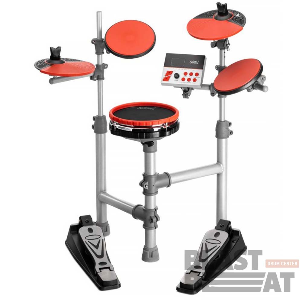 Компактная складная электронная ударная установка Soundking SD30M с удобной регулировка высоты и полыми пэдами тарелок. В комплект входят: