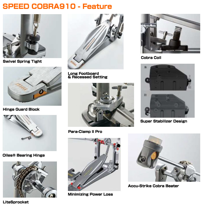 Tama HP910LN имеет возможность настройки углов наклона футборда, колотушки и натяжения цепи. Она оснащена регулируемым зажимом для крепления к обручу бас-барабана.
