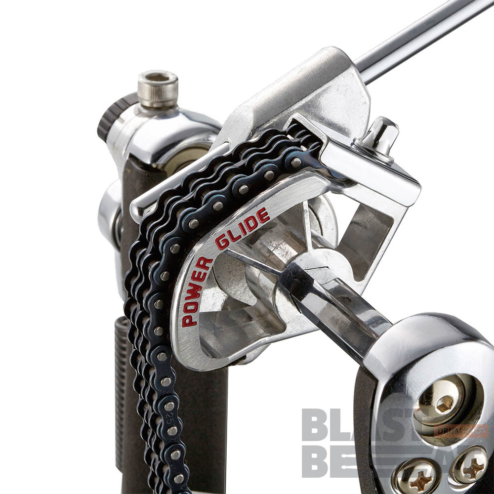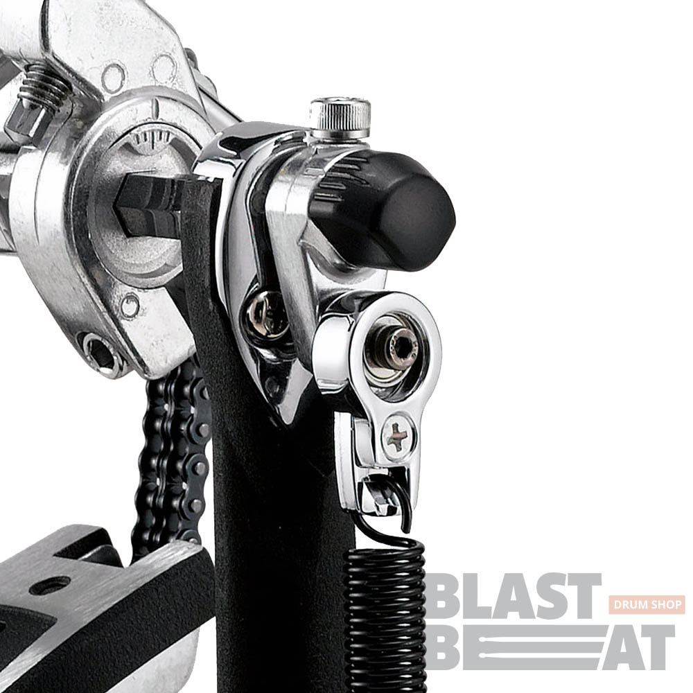 Педаль имеет простой и удобный механизм настройки угла наклона колотушки, стальной зажим обруча с барашковым винтовым зажимом, механизмом натяжения цепи с прочным фиксатором положения, стальные тяги опорной рамы педали и двойной цепной привод.
