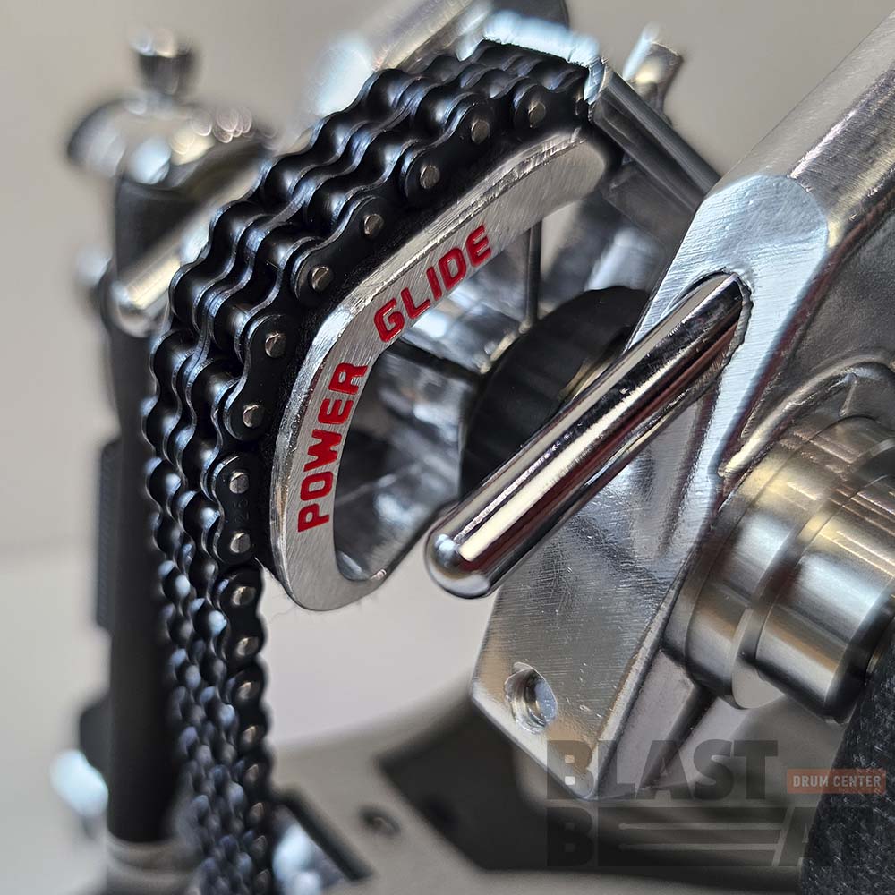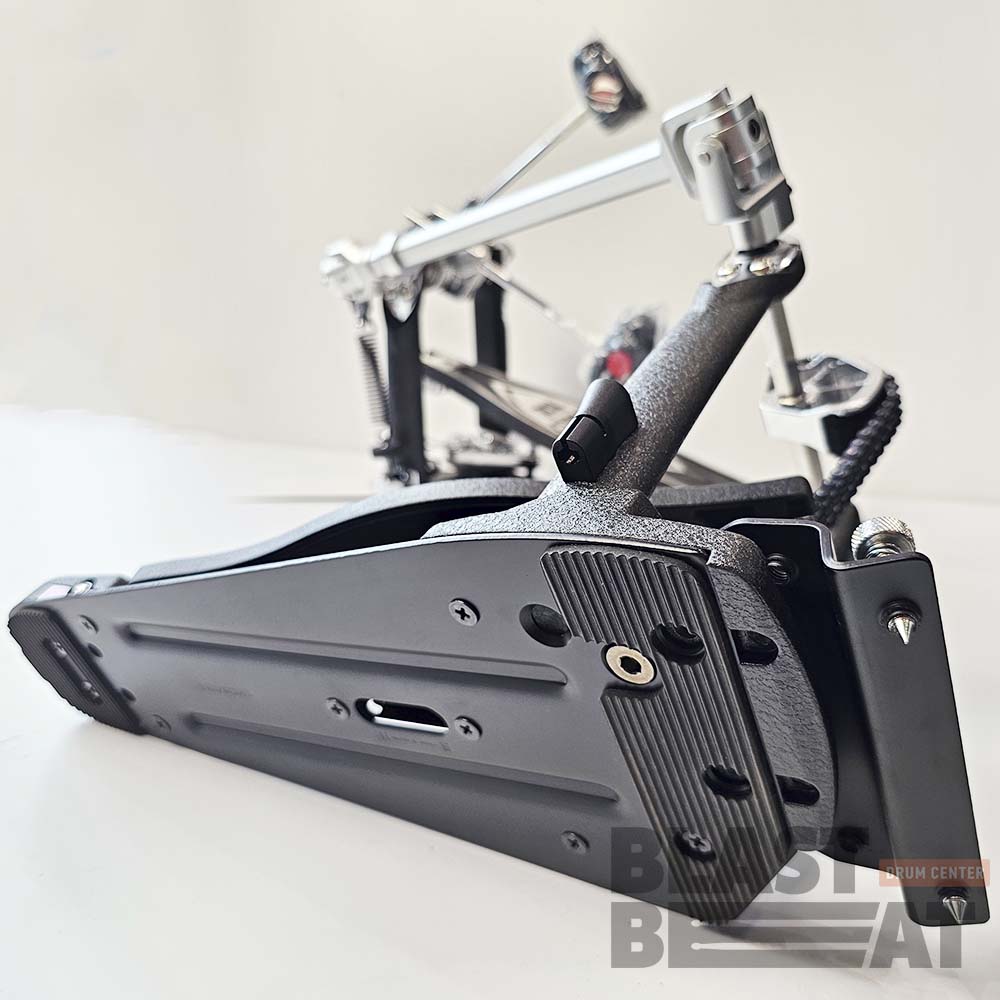 Педаль имеет простой и удобный механизм настройки угла наклона колотушки, стальной зажим обруча с барашковым винтовым зажимом, механизмом натяжения цепи с прочным фиксатором положения, стальные тяги опорной рамы педали и двойной цепной привод.