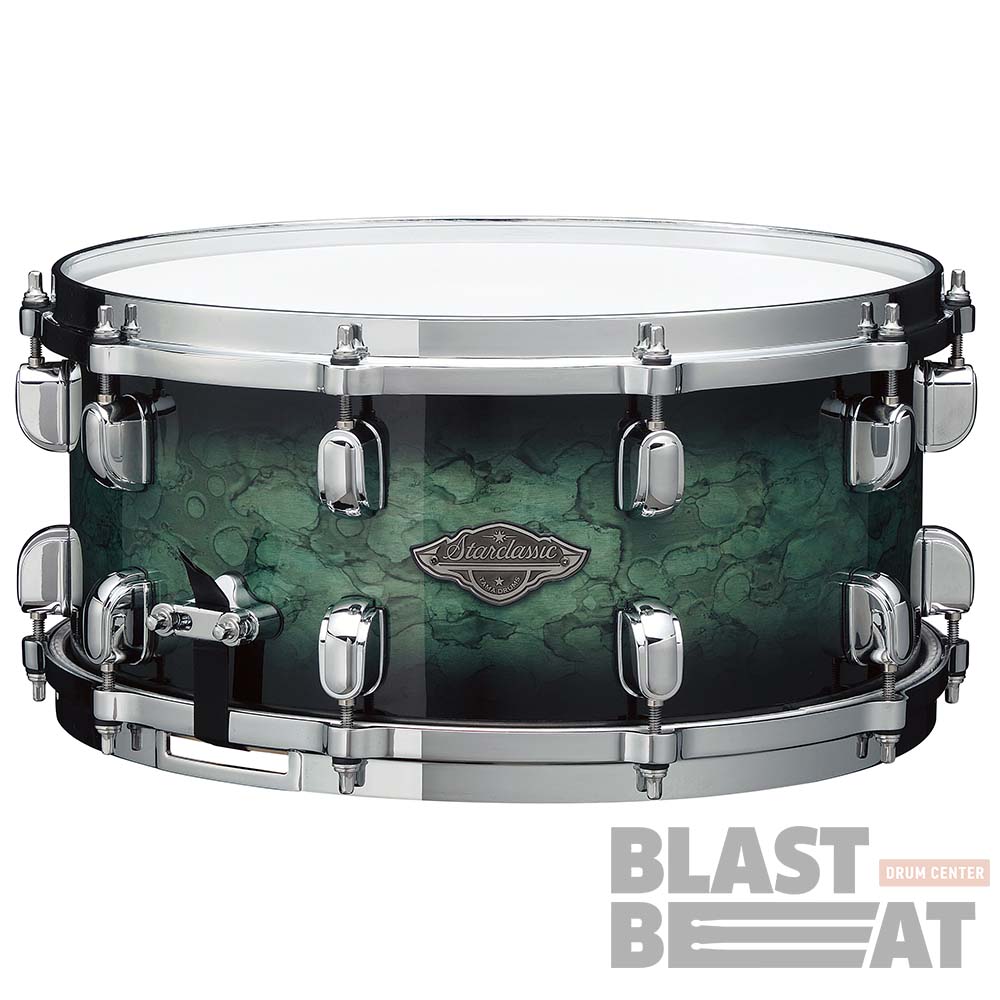 Первоклассный малый барабан размером 14 на 6,5 дюймов крайне интересной зелёно-серой расцветки, относящийся к топовой линейке Starclassic Performer компании Tama Drums, созданный для профессиональных барабанщиков и студийной работы.
