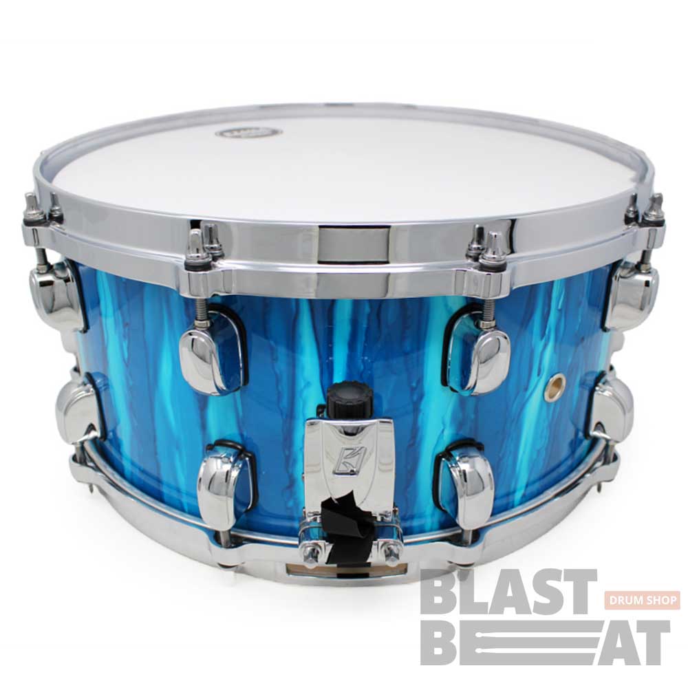 Первоклассный малый барабан размером 14 на 6,5 дюймов сине-голубой расцветки, относящийся к топовой линейке Starclassic Performer компании Tama Drums, созданный для профессиональных барабанщиков и студийной работы.