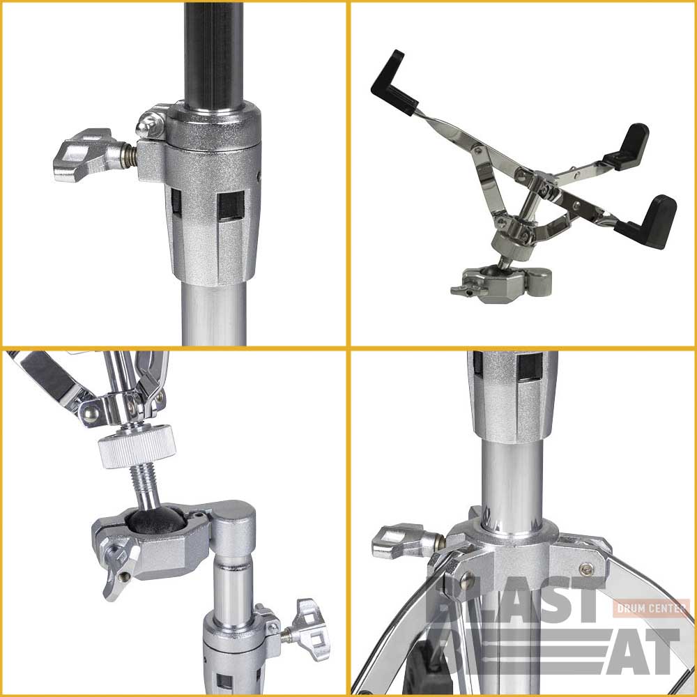 Сильной стороной подставки для малого барабана серии 800 является “шаровой” шарнир, на который опирается корзина для малого барабана. Эта система обеспечивает вращение корзины на 360° и точный и стабильный наклон благодаря “зажиму”, который обеспечивает фиксацию шара. Наклон зависит от личных предпочтений барабанщика.