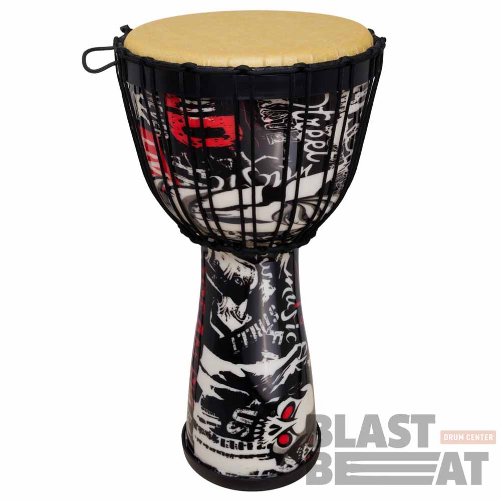 Джембе барабан размерами 10 на 20 дюймов из пластика с синтетической мембраной и ярким дизайном в панк-стиле.