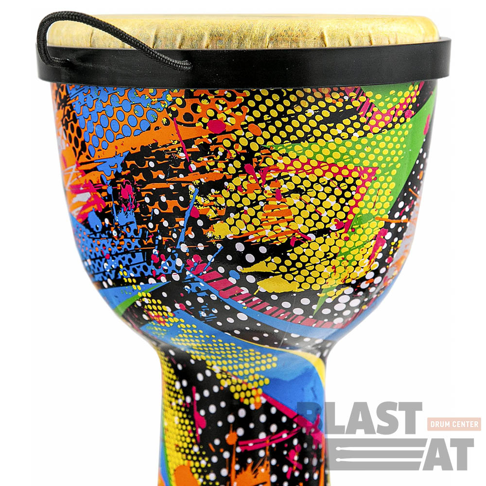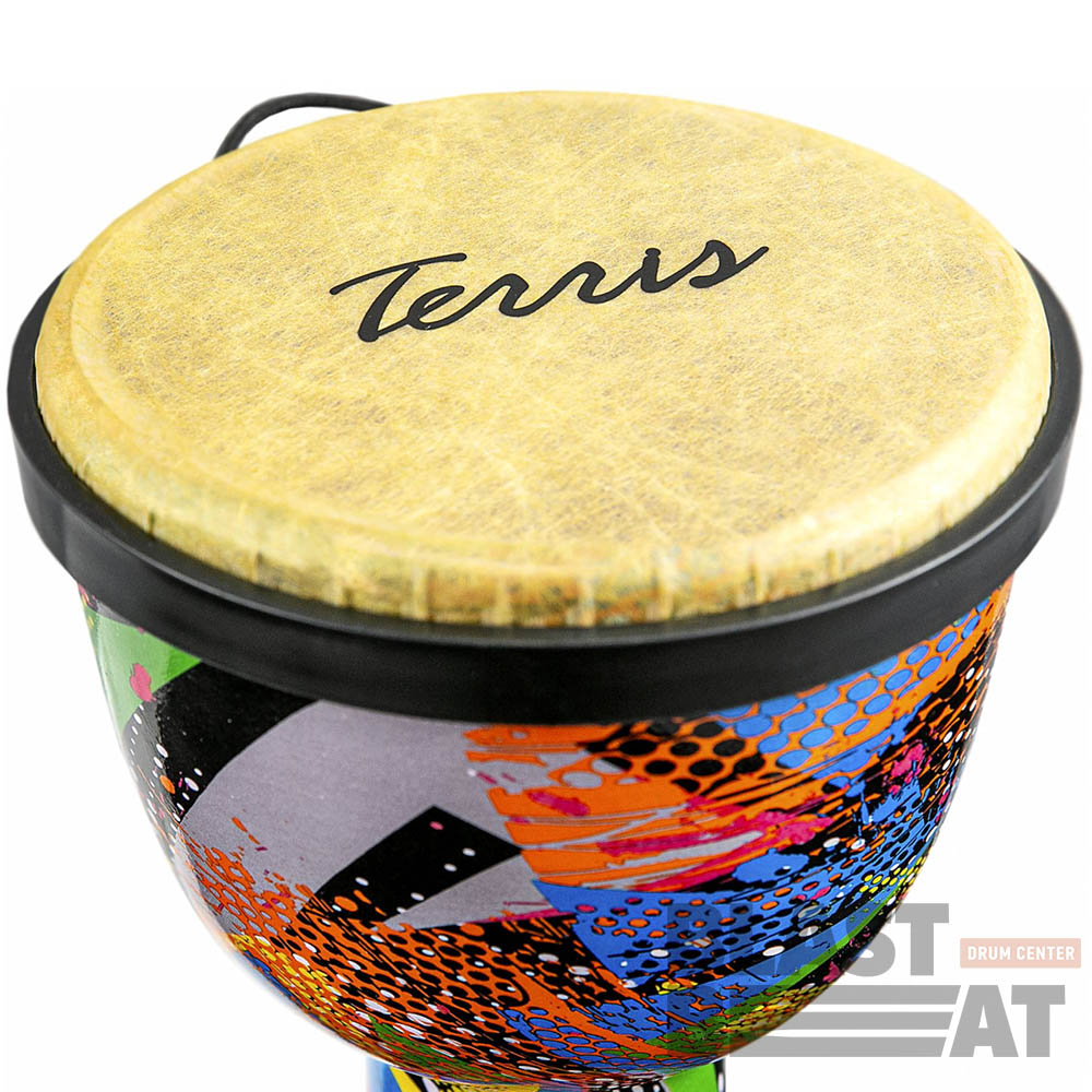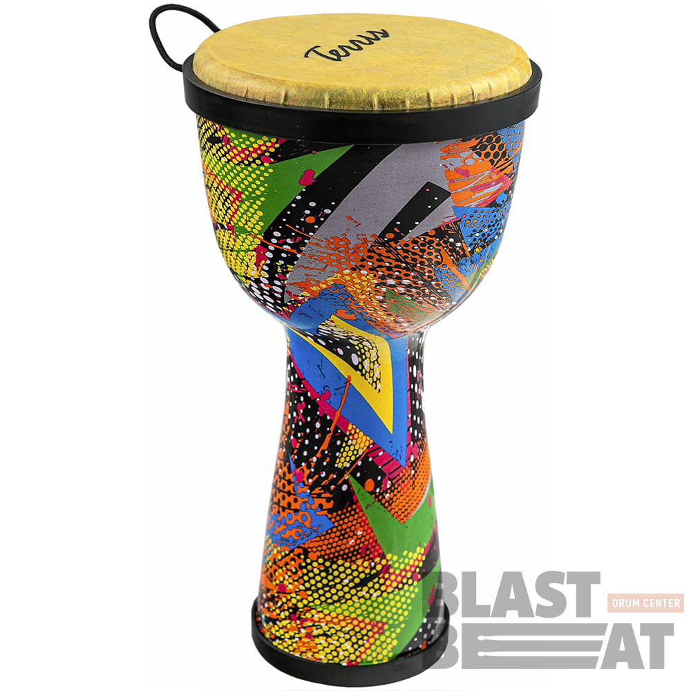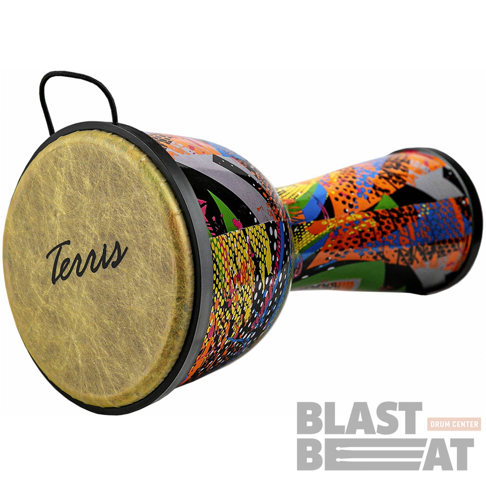 Восточный барабан джембе из пластика с синтетической мембраной большого размера 10 на 20 дюймов и разноцветной расцветке, стилизованными под африканские одеяния от компании Terris.
