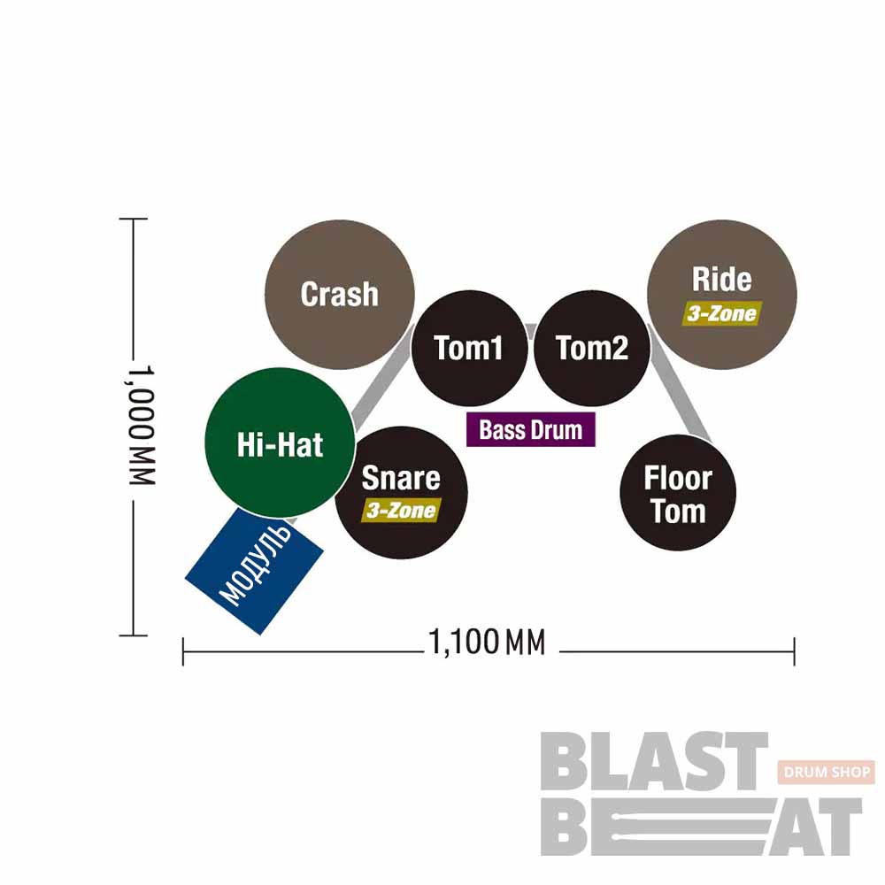 - Трехзонные пэды малого барабан и тарелки райд. Тарелку можно как зажать рукой (для контроля сустейна), так и полностью заглушить. Пэд тарелки райд снабжен функцией определения положения точки удара