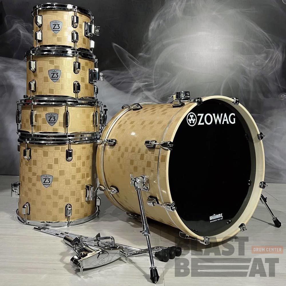 Комплект барабанов ударной установки Modern Rock из тополя серии Z3 золотистого цвета с квадратами (Gold Square) со стойками, стулом и педалью от бренда Zowag Drums.